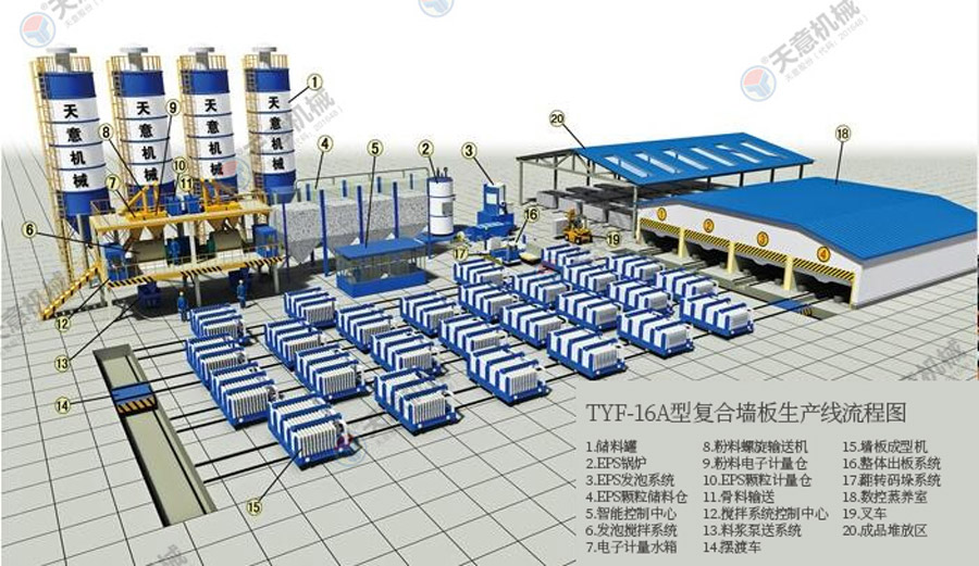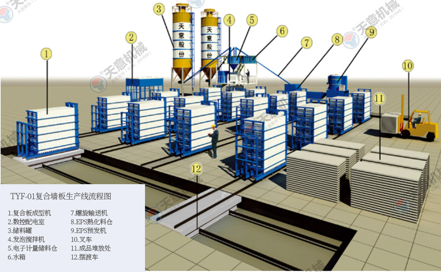 TY12型墻板生產(chǎn)線包括:墻板成型機(jī)、整體穿抽管系統(tǒng)、發(fā)泡系統(tǒng)、水箱、電子計(jì)量儲(chǔ)料倉、螺旋上料輸送機(jī)、儲(chǔ)料罐、螺旋輸送機(jī)、EPS熟化料倉、硫化干燥床、EPS預(yù)發(fā)機(jī)、數(shù)控配電室、發(fā)泡攪拌機(jī)、整體出板系統(tǒng)、叉車、成品堆放區(qū)、擺渡車。