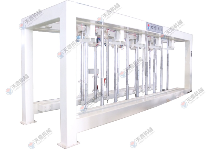 脫模后的坯體連同側(cè)板一起放置在切割小車上,切割小車由減速電機(jī)驅(qū)動(dòng)行走,通過縱向切割機(jī)完成縱向切割,切割小車?yán)^續(xù)行走至橫向 切割機(jī)中間位置停止后,由小車置換裝置將側(cè)板連同坯體抬起,切割小車退回翻轉(zhuǎn)行車底下進(jìn)行下一次承載脫模后的坯體,另外一部切割小車 進(jìn)入置換裝置底下后, 置換裝置將側(cè)板連同坯體放置該切割小車上后,橫向切割動(dòng)作后啟動(dòng)進(jìn)行橫向切割動(dòng)作,切割完成后,切割小車再行走至確地行車底下,再由 翻轉(zhuǎn)去底行車將坯體去底(連側(cè)板)吊至蒸養(yǎng)小車上,切割小車范圍原始位置進(jìn)行下一個(gè)切割循環(huán)。