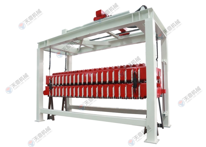 脫模后的坯體連同側(cè)板一起放置在切割小車上,切割小車由減速電機(jī)驅(qū)動行走,通過縱向切割機(jī)完成縱向切割,切割小車?yán)^續(xù)行走至橫向 切割機(jī)中間位置停止后,由小車置換裝置將側(cè)板連同坯體抬起,切割小車退回翻轉(zhuǎn)行車底下進(jìn)行下一次承載脫模后的坯體,另外一部切割小車 進(jìn)入置換裝置底下后, 置換裝置將側(cè)板連同坯體放置該切割小車上后,橫向切割動作后啟動進(jìn)行橫向切割動作,切割完成后,切割小車再行走至確地行車底下,再由 翻轉(zhuǎn)去底行車將坯體去底(連側(cè)板)吊至蒸養(yǎng)小車上,切割小車范圍原始位置進(jìn)行下一個(gè)切割循環(huán)。