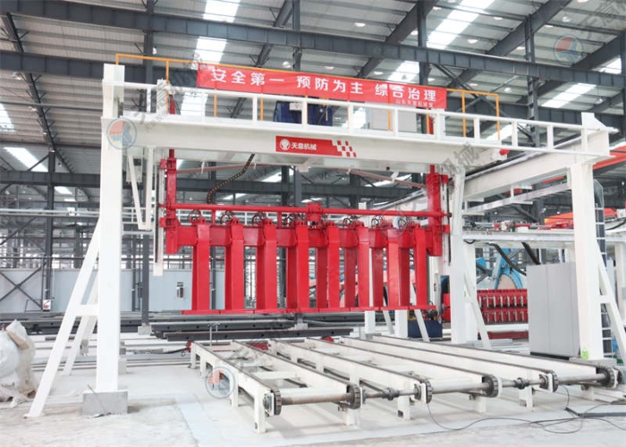 將板材吊運(yùn)至板材輸送機(jī)或者將砌塊吊運(yùn)至移動(dòng)并坯機(jī)上;