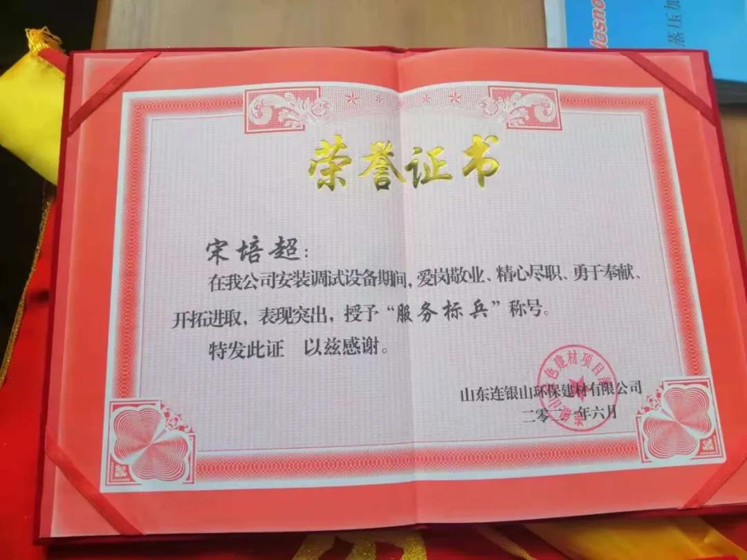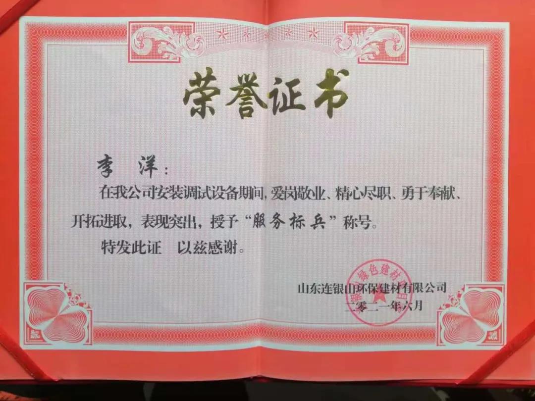 炎炎夏日,天意機械在向客戶山東連銀山環(huán)保建材有限公司售出保溫裝飾一體化板生產(chǎn)線之后,隨即派出售后團隊對設備進行安裝調(diào)試及售后培訓。售后團隊不畏酷暑,精心、耐心、專業(yè)地為客戶進行安裝調(diào)試,贏得了客戶的好評和認可,客戶為表達謝意,特授予天意機械售后人員榮譽證書和錦旗,以表彰售后人員愛崗敬業(yè)、精心盡職、勇于奉獻、開拓進取的精神。