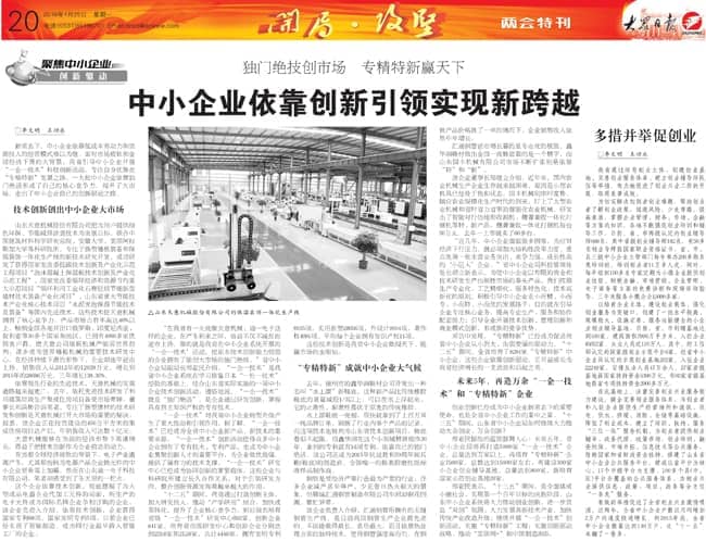 2015年1月25日的大眾日報?兩會特刊《獨門絕技創(chuàng)市場 專精特新贏天下――中小企業(yè)依靠創(chuàng)新引領實現(xiàn)新跨越》重點介紹了我公司技術創(chuàng)新的經驗,敬請關注。